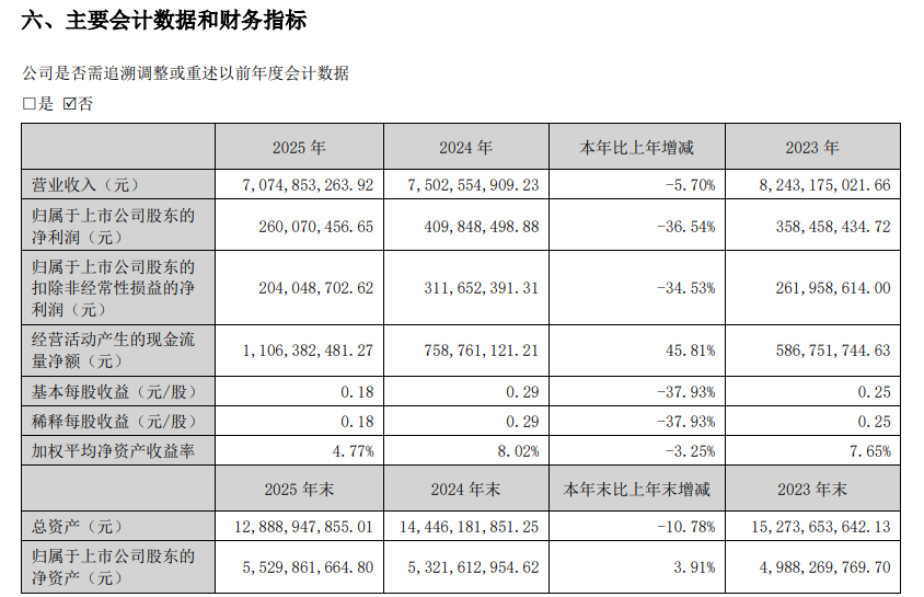 4月3日,东北制药发布2025年年度敷陈,数据流露,2025年公司已毕营业收入70.75亿元,同比下落5.70%;包摄于上市公司鼓舞的净利润为2.60亿元,同比大幅下落36.54% ;扣除非同样性损益的净利润为2.04亿元,同比减少34.53%。其利润的下滑幅度远超营收的降幅,基本每股收益也从上一年的0.29元回落至0.18元。