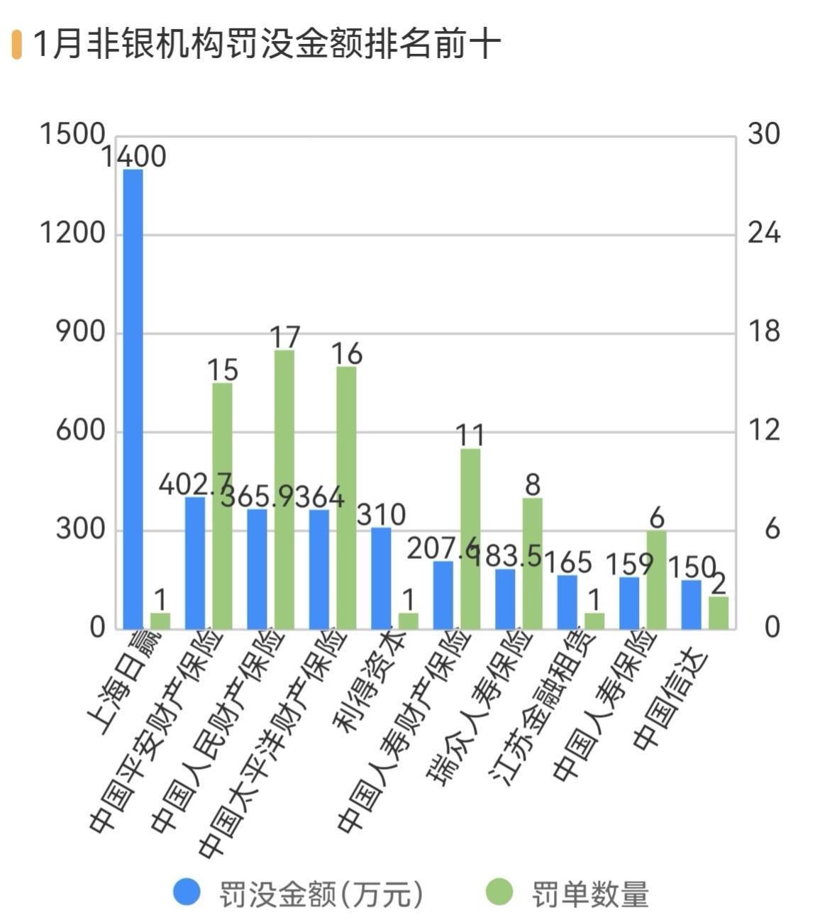 1月罚没金额排前十的非银机构以保障公司居多,此外包括私募基金、金融租借公司、金钱贬责公司(AMC)。